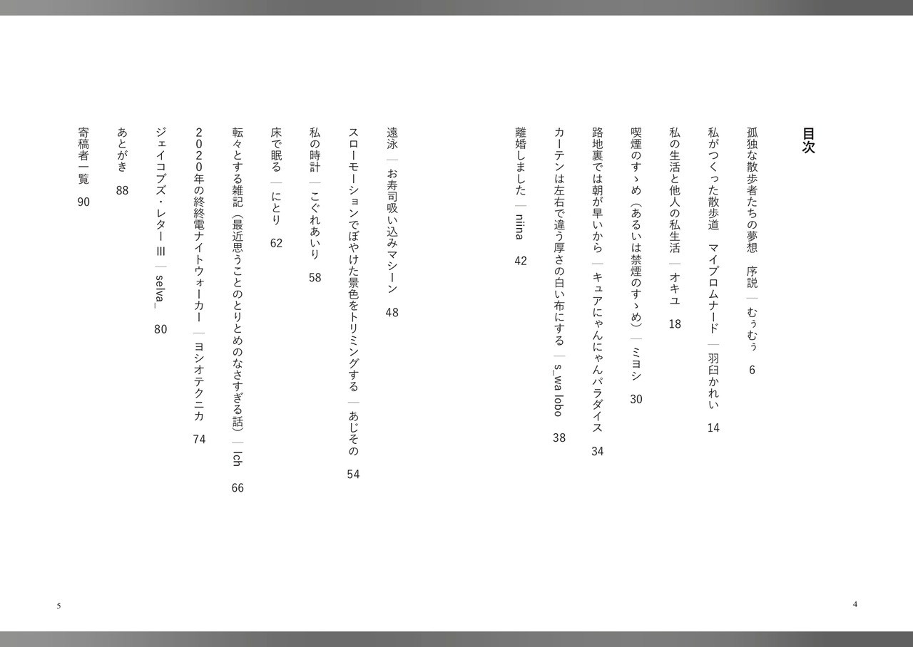 日々の生活という筋書きなき遊歩道を歩きながら、浮かんでは消え、消えては浮かぶ断片的な想念を書き留め、深掘りし、横道に逸れ、時に飛躍させながら放浪するかのように書き記し、その思考の足跡を残していくことを趣旨に制作されました。